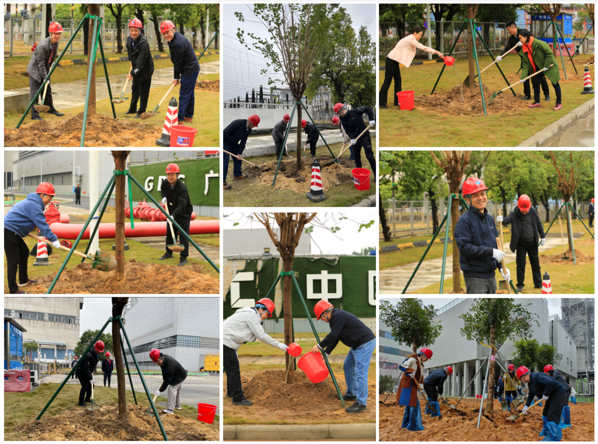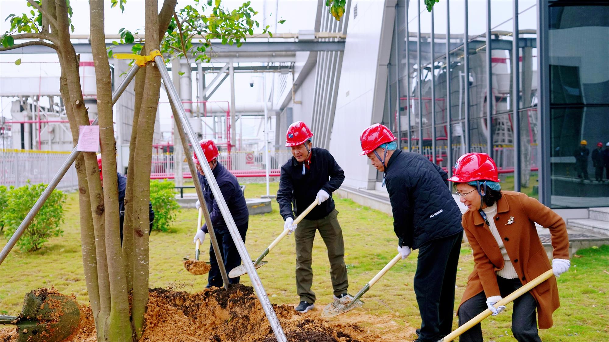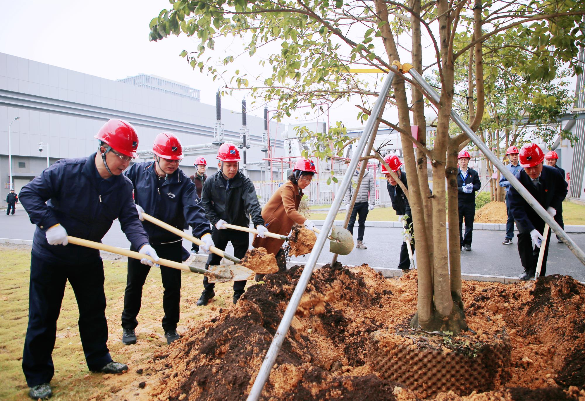 启动仪式结束后,在集团领导的带领下,参加植树活动的人员分区分组投入到南沙电力公司、珠江电厂园区的绿化植树工作中。大家热情高涨、分工明确、配合默契、干劲十足,挥锹铲土、扶树填土、踩实修整、围堰浇水……各道工序井然有序。在大家的共同努力下,铁冬青、宫粉紫荆、桃花新木、粉花风铃木、杨梅树和柚子树等50多棵新树木迎风挺立,错落有致,成为南沙产业园区新的风景线、春景图。